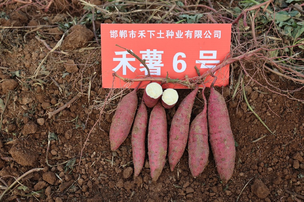 品种名称:禾薯6号 申 请 者:邯郸市禾下土种业有限公司 作物种类:甘薯特征特性:鲜食品种。中熟,生育期120天。植株生长习性匍匐,蔓长长,平均基部分枝10个。无裂片品种心形,茎顶芽相对位置凹,茎顶芽花青苷显色强度弱,茎顶端绒毛疏,叶中等绿色。薯块纺锤,薯皮紫红色,薯肉浅黄色。萌芽数量中,萌芽一致性一致,结薯习性较集中。烘干率33.39%,淀粉率22.69%,粗蛋白含量2.5%,还原糖含量1.1%,可溶糖含量3.22%,胡萝卜素合量0.0501毫克/100克,花青素含量0毫克,甜糯。感根腐病,中抗黑斑病,中抗茎线虫病,中抗蔓割病,感薯瘟病,适应性强。鲜薯产量:第1生长周期亩产1623.89千克,比对照商薯19减产58.96%;第2生长周期亩产1475.89千克,比对照商薯19减产41.65%;薯干产量:第1生长周期亩产518.51千克,比对照商薯19减...