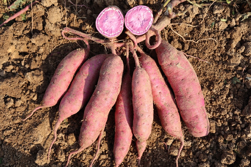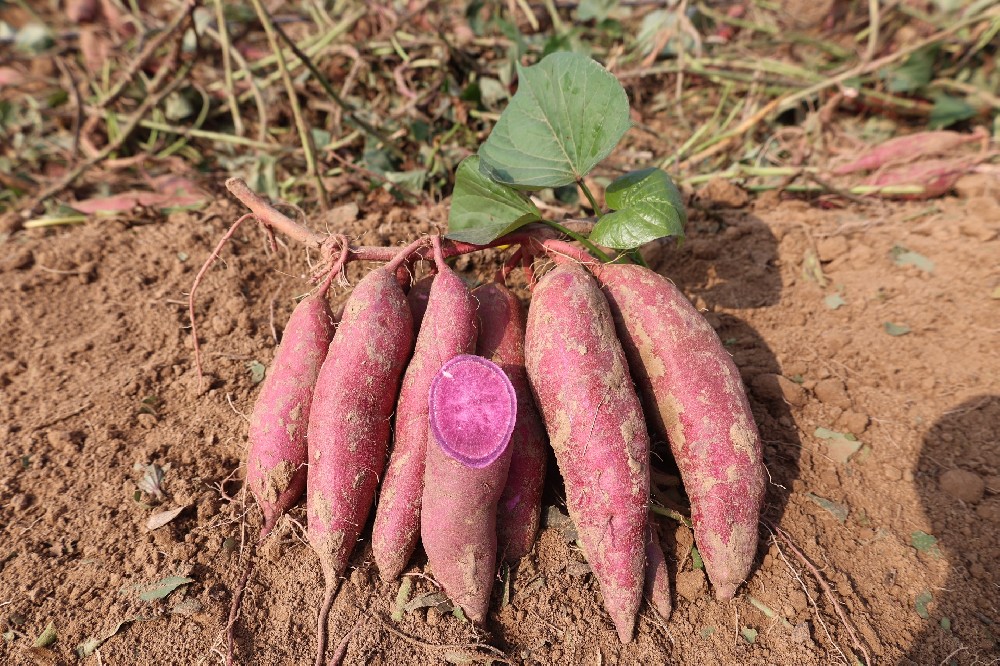 品种名称:禾紫薯1号申 请 者:邯郸市禾下土种业有限公司作物种类:甘薯品种来源:山川紫放任授粉特征特性:高花青素品种。中熟,生育期120天。植株生长习性匍匐,蔓长长,平均基部分枝9个。无裂片品种心形,茎顶芽相对位置平,茎顶芽花青苷显色强度强,茎顶端绒毛密,叶中等绿色。薯块纺锤,薯皮中等紫色,薯肉中等紫色。萌芽数量多,萌芽一致性一致,结薯习性松散。烘干率32.14%,淀粉率21.78%,粗蛋白2.34%,还原糖1%,可溶糖3.23%,胡萝卜素0.0908毫克/100克,花青素1.97毫克/100克,甜糯。高感根腐病,抗黑斑病,高感茎线虫病,中抗蔓割病,感薯瘟病,适应性强。鲜薯产量:第1生长周期亩产2438.2千克,比对照徐紫薯8号减产18.20%;第2生长周期亩产1902.47千克,比对照徐紫薯8号减产13.36%;薯干产量:第1生长周期亩产767.54千克...