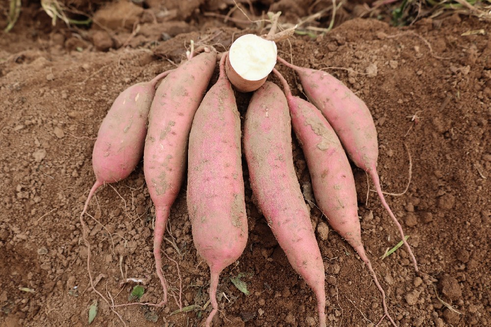 品种名称:红金薯2号 申 请 者:邯郸市禾下土种业有限公司;邯郸市农业科学院 作物种类:甘薯 登记编号:GPD甘薯(2024)130030 特征特性:鲜食类型品种。早熟。生育期120天。植株生长习性甸匐,蔓长中等,平均基部分枝8个。无裂片品种心形,茎顶芽相对位置凹,茎顶芽花青苷显色强度无,茎顶端绒毛中等,叶紫色。薯块不规则,薯皮紫红色,薯肉中等橙红色。萌芽数量中,萌芽一致性一致,结薯习性集中。烘干率24.16%,淀粉率14.66%,粗蛋白含量1.5%,还原糖含量5%,可溶糖含量5.39%,胡萝卜素含量1.20毫克/100克,花青素含量0.922毫克/100克,糯。中抗根腐病,中抗黑斑病,高感茎线虫病,中抗蔓割病,高感薯瘟病,适应性强。鲜薯产量:第1生长周期亩产2243.7千克,比对照广薯87增产11.15%;第2生长周期亩产2305.9千...
