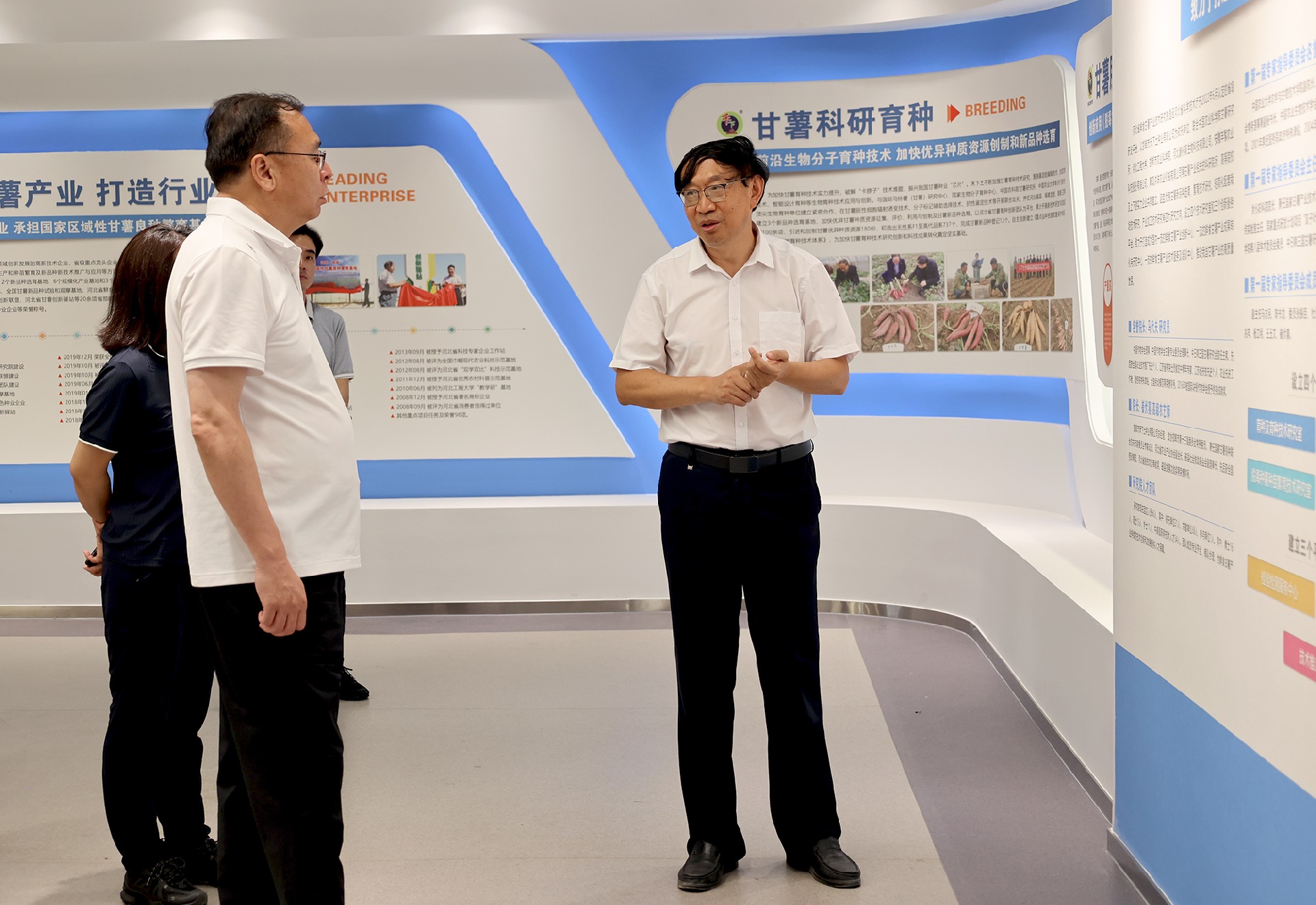 2024年7月21日,邯郸市农业农村局党组书记、局长王常智一行莅临禾下土调研。调研组一行参观了综合展厅,听取企业总经理崔伏喜对甘薯新品种选育、脱毒组培、基地规模的情况介绍,了解了禾下土在脱毒甘薯种业领域的创新发展成果。磁县农业农村局党组书记王国栋、副局长靳合成、党委委员武鹏飞陪同调研。